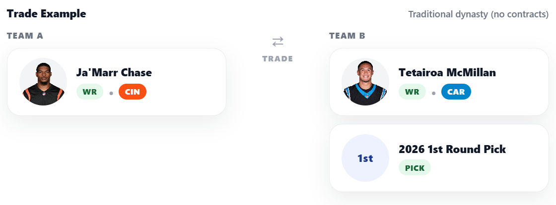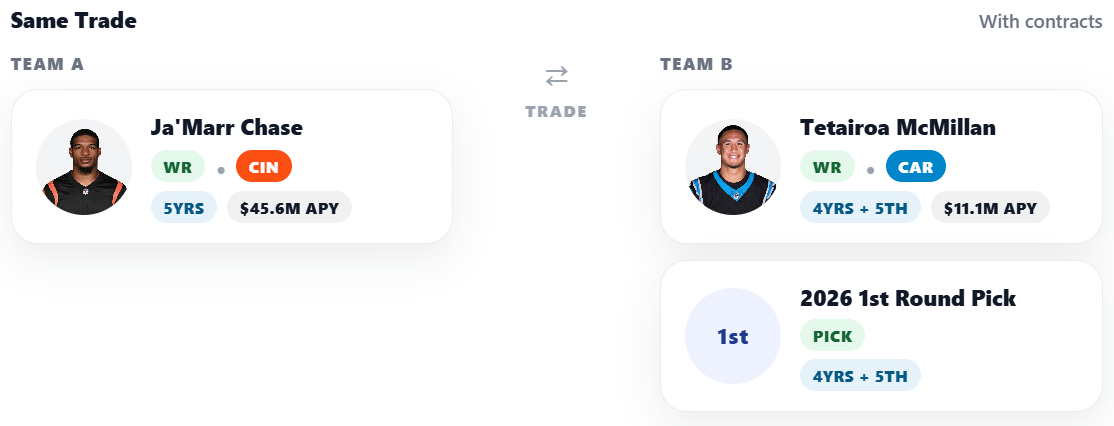 Now, looking at this trade from a traditional dynasty league standpoint, most would say this trade is not particularly close. WR Ja’Marr Chase is a top 5 dynasty asset; he is still relatively young (25 years old), and is in a very fantasy-friendly offense with him tied to QB Joe Burrow for the next 5 years at least. WR Tetaiaroa McMillan has certainly had a promising rookie season, and the 2026 1st is compelling, but I would argue most managers would feel that you would need to add at least another 1st. Now let’s look at this example with contracts involved: