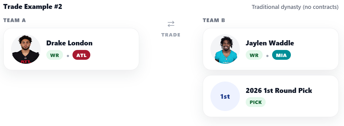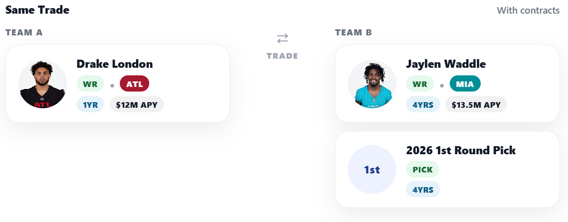 See the difference? This changes the value drastically! The fantasy football manager receives a below-market cost-controlled contract with WR Jaylen Waddle for 4 years at an average pay per year (APY) of $13.5M whereas London is set to be a free agent after the season, and he will want a boatload of money. How does $33M/yr sound to you for London for the next 5 years? Now that the fantasy manager may still be inclined to keep London for that amount, but it brings up more questions. Who is going to be the QB in Atlanta? Would they be better off getting a solid WR2 in Waddle and getting a 1st round pick to help bolster their roster?
